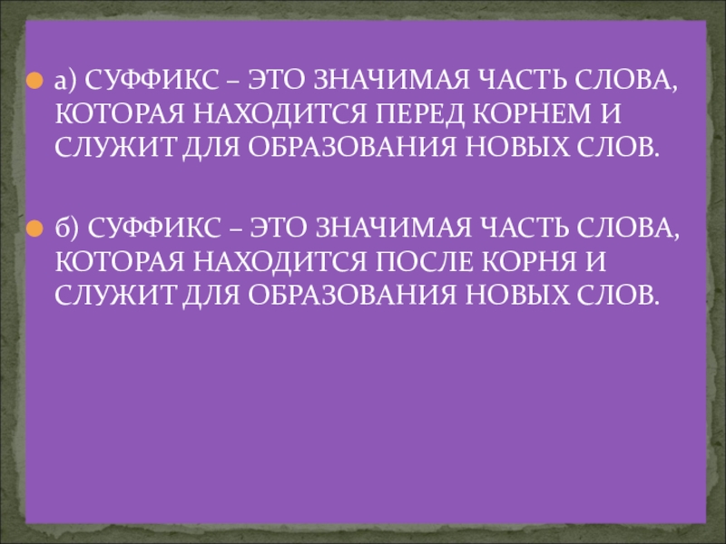 а) СУФФИКС – ЭТО ЗНАЧИМАЯ ЧАСТЬ СЛОВА, КОТОРАЯ НАХОДИТСЯ ПЕРЕД КОРНЕМ И СЛУЖИТ ДЛЯ ОБРАЗОВАНИЯ НОВЫХ СЛОВ.б)