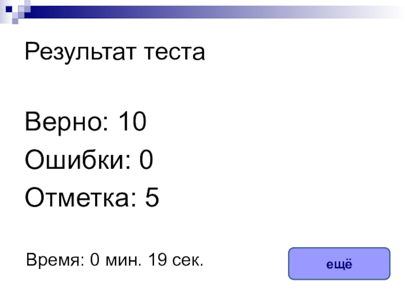 Результат тестаВерно: 10Ошибки: 0Отметка: 5Время: 0 мин. 19 сек.ещё