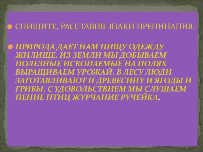 СПИШИТЕ, РАССТАВИВ ЗНАКИ ПРЕПИНАНИЯ.ПРИРОДА ДАЕТ НАМ ПИЩУ ОДЕЖДУ ЖИЛИЩЕ. ИЗ ЗЕМЛИ МЫ ДОБЫВАЕМ ПОЛЕЗНЫЕ ИСКОПАЕМЫЕ НА ПОЛЯХ