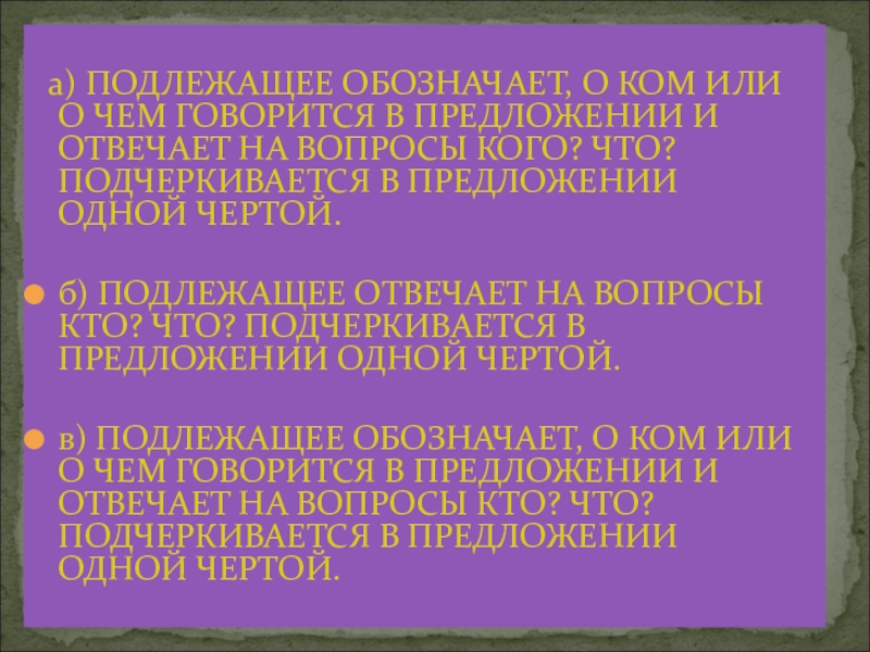 в) ПОДЛЕЖАЩЕЕ ОБОЗНАЧАЕТ, О КОМ ИЛИ О ЧЕМ ГОВОРИТСЯ В ПРЕДЛОЖЕНИИ И ОТВЕЧАЕТ НА ВОПРОСЫ КТО? ЧТО? ПОДЧЕРКИВАЕТСЯ В ПРЕДЛОЖЕНИИ ОДНОЙ ЧЕРТОЙ.