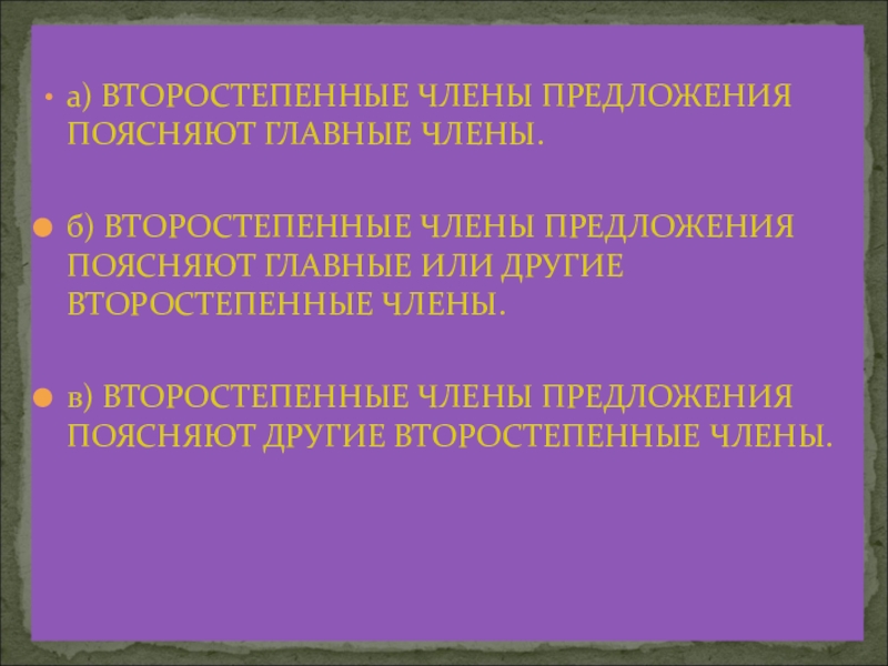 а) ВТОРОСТЕПЕННЫЕ ЧЛЕНЫ ПРЕДЛОЖЕНИЯ ПОЯСНЯЮТ ГЛАВНЫЕ ЧЛЕНЫ.б) ВТОРОСТЕПЕННЫЕ ЧЛЕНЫ ПРЕДЛОЖЕНИЯ ПОЯСНЯЮТ ГЛАВНЫЕ ИЛИ ДРУГИЕ ВТОРОСТЕПЕННЫЕ ЧЛЕНЫ.в) ВТОРОСТЕПЕННЫЕ
