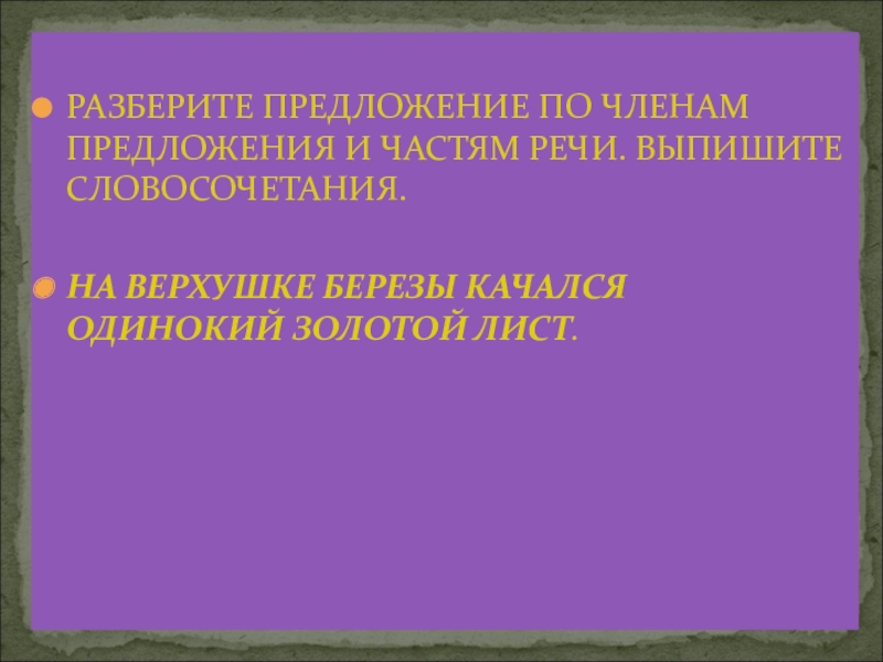 РАЗБЕРИТЕ ПРЕДЛОЖЕНИЕ ПО ЧЛЕНАМ ПРЕДЛОЖЕНИЯ И ЧАСТЯМ РЕЧИ. ВЫПИШИТЕ СЛОВОСОЧЕТАНИЯ.НА ВЕРХУШКЕ БЕРЕЗЫ КАЧАЛСЯ ОДИНОКИЙ ЗОЛОТОЙ ЛИСТ.