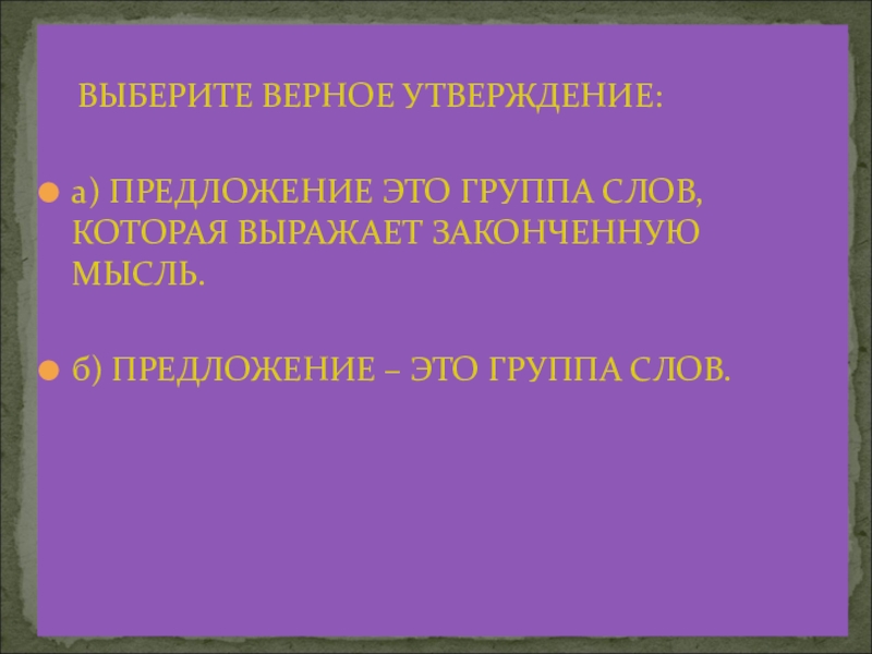 ВЫБЕРИТЕ ВЕРНОЕ УТВЕРЖДЕНИЕ:а) ПРЕДЛОЖЕНИЕ ЭТО ГРУППА СЛОВ, КОТОРАЯ ВЫРАЖАЕТ ЗАКОНЧЕННУЮ МЫСЛЬ.б) ПРЕДЛОЖЕНИЕ – ЭТО ГРУППА СЛОВ.