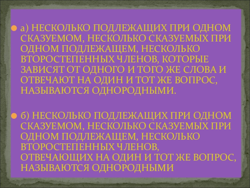 б) НЕСКОЛЬКО ПОДЛЕЖАЩИХ ПРИ ОДНОМ СКАЗУЕМОМ, НЕСКОЛЬКО СКАЗУЕМЫХ ПРИ ОДНОМ ПОДЛЕЖАЩЕМ, НЕСКОЛЬКО ВТОРОСТЕПЕННЫХ ЧЛЕНОВ, ОТВЕЧАЮЩИХ НА ОДИН И ТОТ ЖЕ ВОПРОС, НАЗЫВАЮТСЯ ОДНОРОДНЫМИ