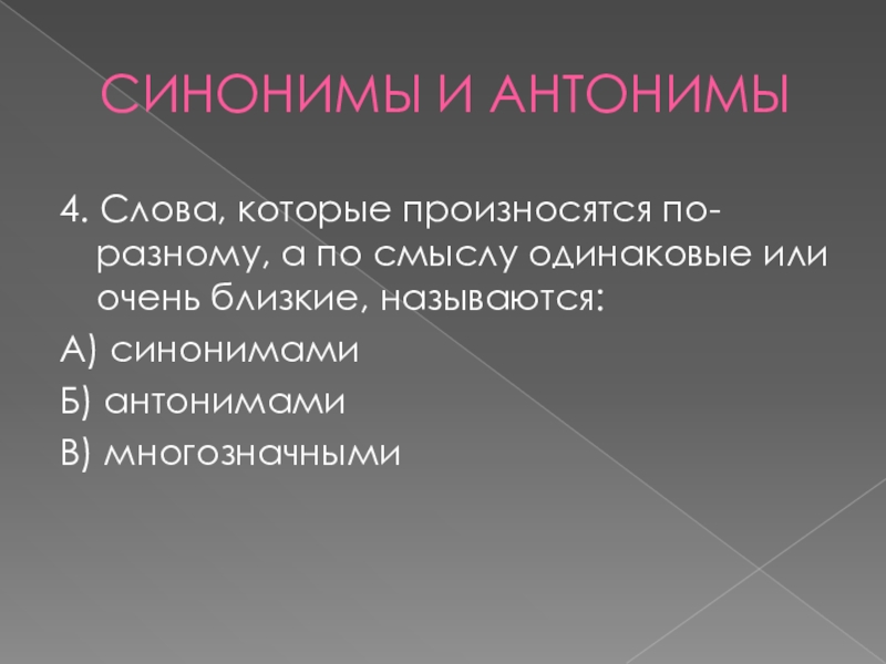 СИНОНИМЫ И АНТОНИМЫ4. Слова, которые произносятся по-разному, а по смыслу одинаковые или очень близкие, называются:А) синонимамиБ) антонимамиВ)