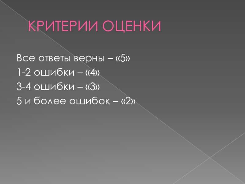 КРИТЕРИИ ОЦЕНКИВсе ответы верны – «5»1-2 ошибки – «4»3-4 ошибки – «3»5 и более ошибок – «2»
