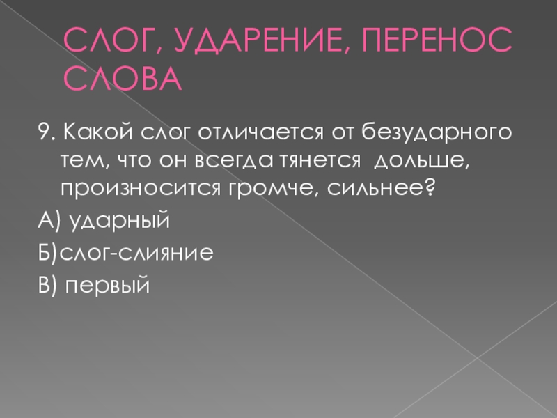 СЛОГ, УДАРЕНИЕ, ПЕРЕНОС СЛОВА9. Какой слог отличается от безударного тем, что он всегда тянется дольше, произносится громче,