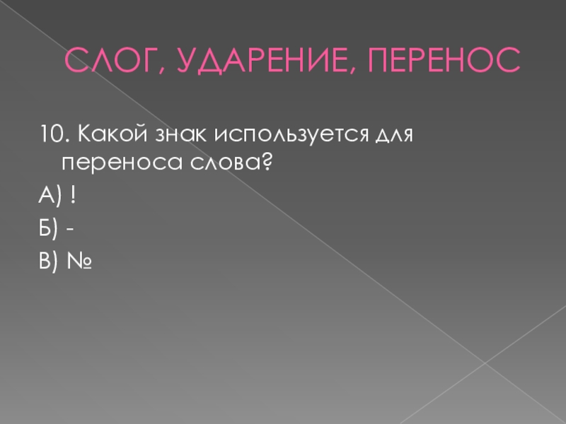 СЛОГ, УДАРЕНИЕ, ПЕРЕНОС10. Какой знак используется для переноса слова?А) !Б) -В) №