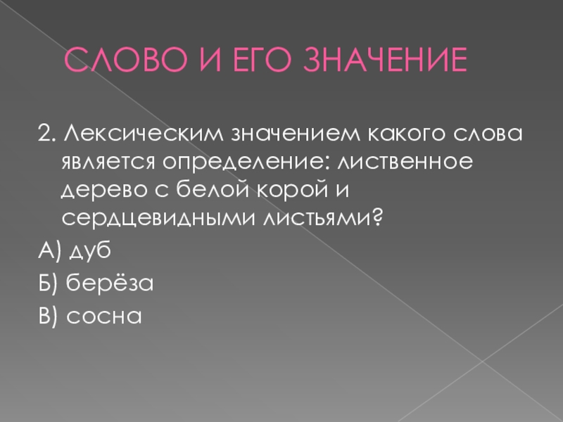 СЛОВО И ЕГО ЗНАЧЕНИЕ2. Лексическим значением какого слова является определение: лиственное дерево с белой корой и сердцевидными