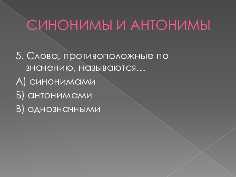 СИНОНИМЫ И АНТОНИМЫ5. Слова, противоположные по значению, называются…А) синонимамиБ) антонимамиВ) однозначными