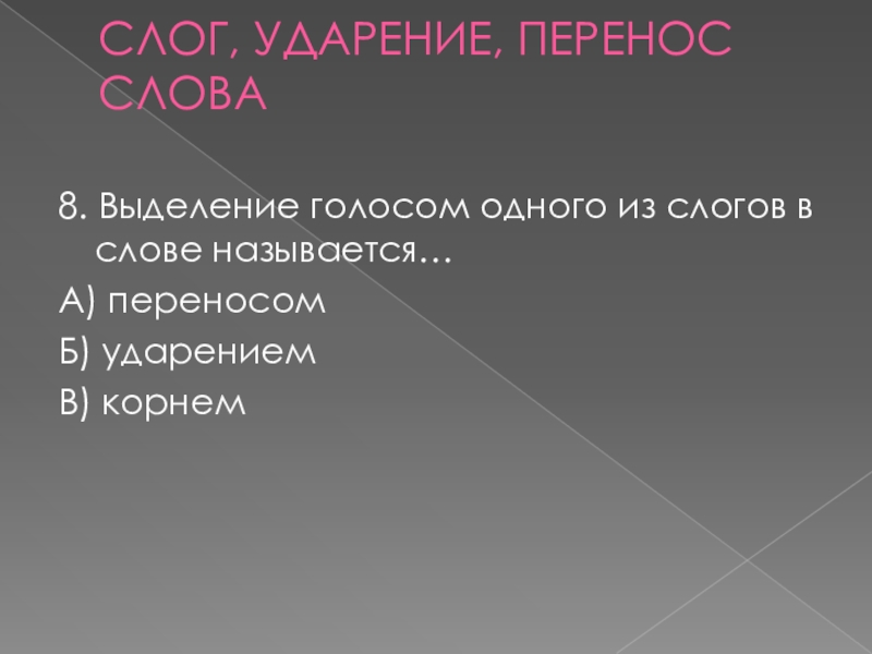 СЛОГ, УДАРЕНИЕ, ПЕРЕНОС СЛОВА 8. Выделение голосом одного из слогов в слове называется…А) переносомБ) ударениемВ) корнем