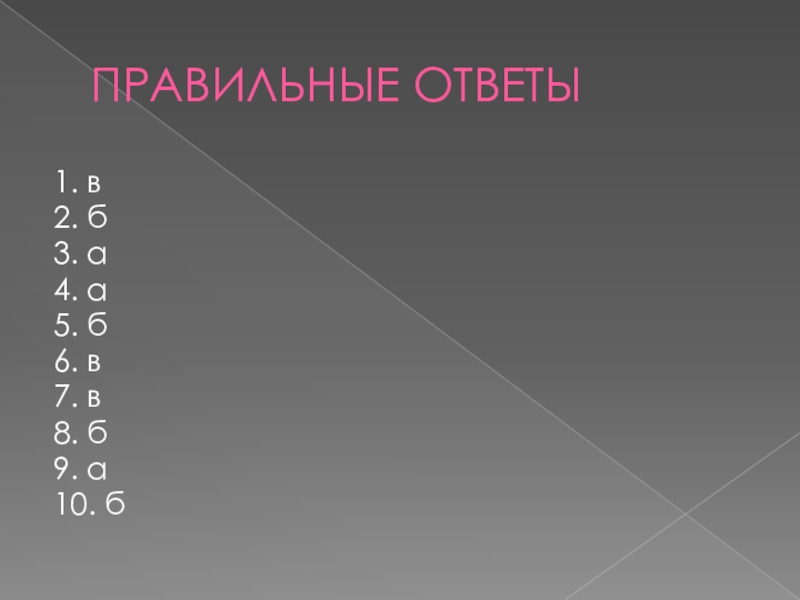 ПРАВИЛЬНЫЕ ОТВЕТЫ1. в2. б3. а4. а5. б6. в7. в8. б9. а10. б