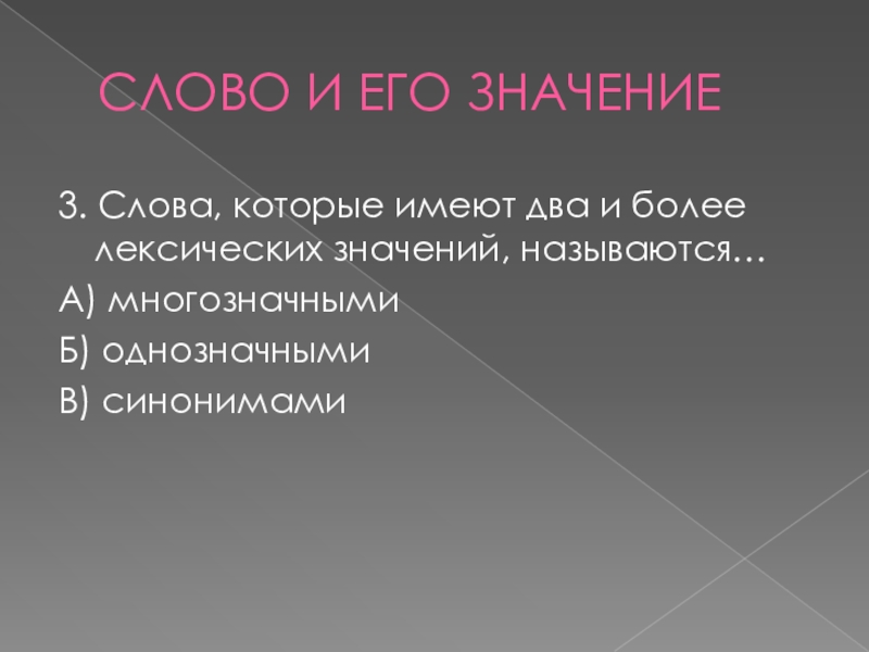 СЛОВО И ЕГО ЗНАЧЕНИЕ3. Слова, которые имеют два и более лексических значений, называются…А) многозначнымиБ) однозначнымиВ) синонимами