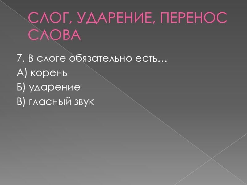 СЛОГ, УДАРЕНИЕ, ПЕРЕНОС СЛОВА7. В слоге обязательно есть…А) кореньБ) ударениеВ) гласный звук