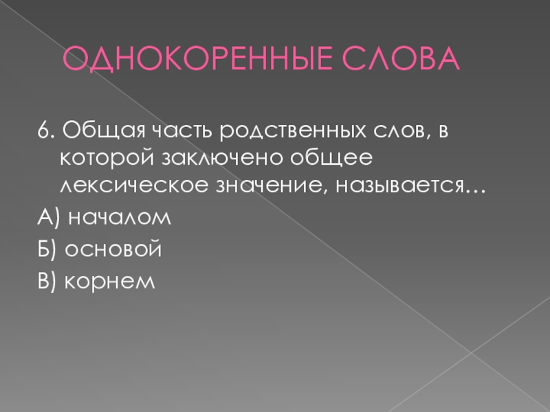 ОДНОКОРЕННЫЕ СЛОВА6. Общая часть родственных слов, в которой заключено общее лексическое значение, называется…А) началомБ) основойВ) корнем
