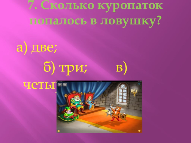 7. Сколько куропаток попалось в ловушку?  а) две;    б) три;