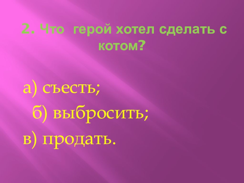 2. Что герой хотел сделать с котом? а) съесть;  б) выбросить; в) продать.