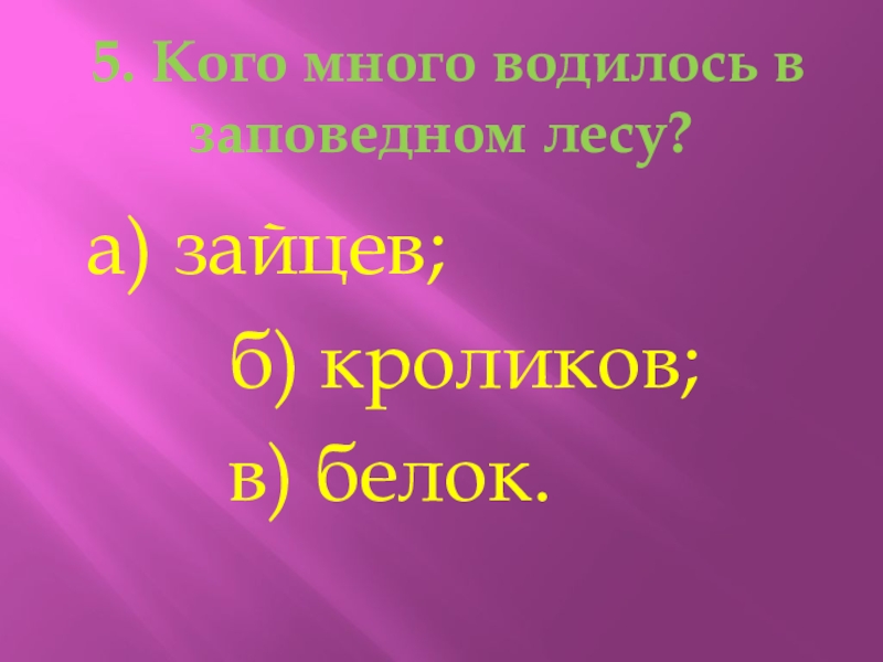 5. Кого много водилось в заповедном лесу? а) зайцев;    б) кроликов;
