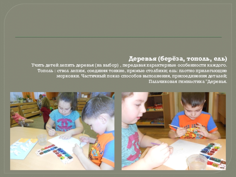 Слайд 7Деревья (берёза, тополь, ель) Учить детей лепить деревья (на выбор) ,
