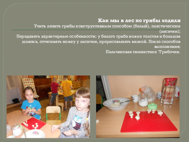 конструктивным способом (белый), пластическим (лисички);  Передавать характерные особенности: у белого гриба ножка толстая и большая шляпка, оттягивать ножку у лисички, прорисовывать вилкой. Показ способов выполнения;  Пальчиковая гимнастика "Грибочки.
