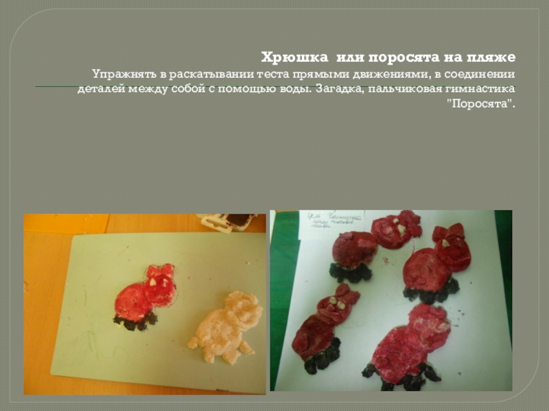 Слайд 16Хрюшка  или поросята на пляже Упражнять в раскатывании теста прямыми движениями,
