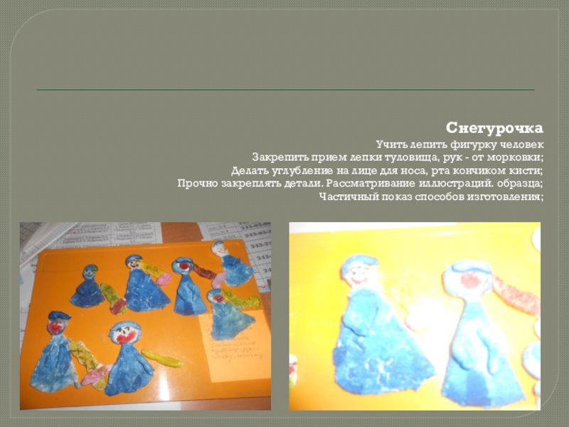 Слайд 11Снегурочка Учить лепить фигурку человек Закрепить прием лепки туловища, рук - от