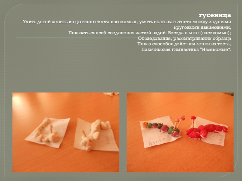 Слайд 2гусеница Учить детей лепить из цветного теста насекомых, уметь скатывать тесто