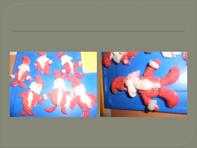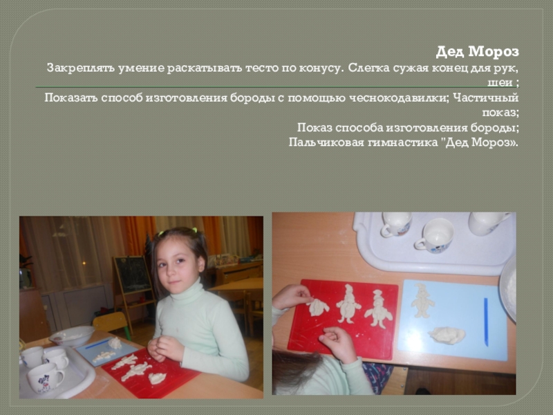 Слайд 9Дед Мороз Закреплять умение раскатывать тесто по конусу. Слегка сужая