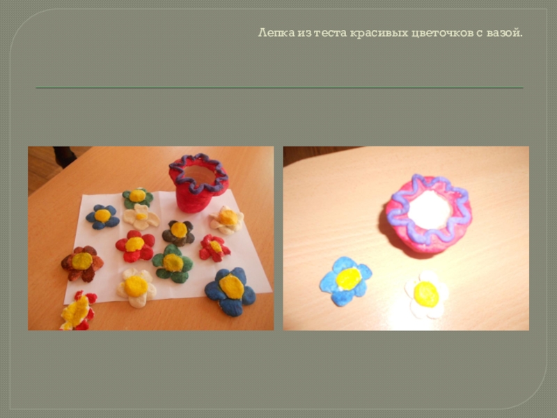 Слайд 15Лепка из теста красивых цветочков с вазой.