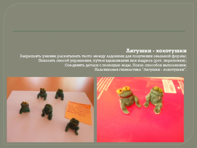 овальной формы;  Показать способ украшения, путем вдавливания или надреза (рот, перепонки); Соединять детали с помощью воды. Показ способов выполнения;  Пальчиковая гимнастика "Лягушки - хохотушки".