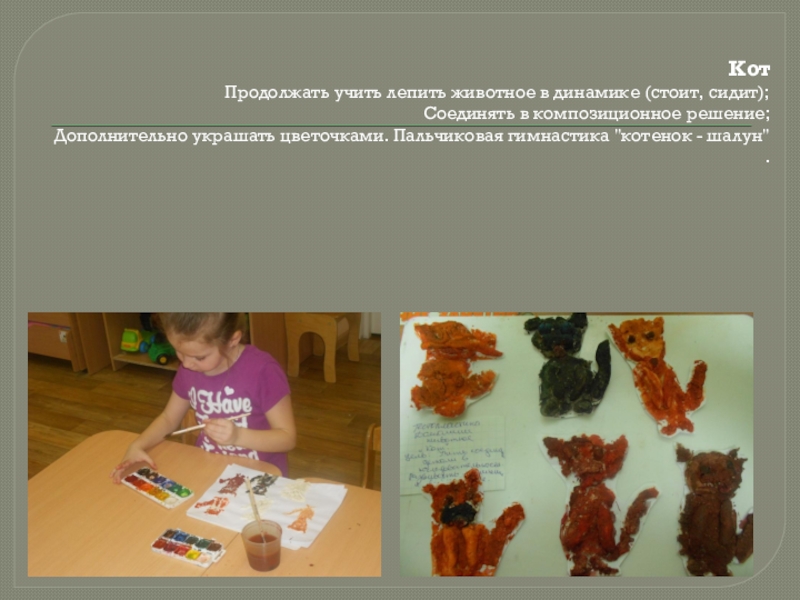 Кот   Продолжать учить лепить животное в динамике (стоит, сидит);  Соединять в композиционное решение; Дополнительно украшать