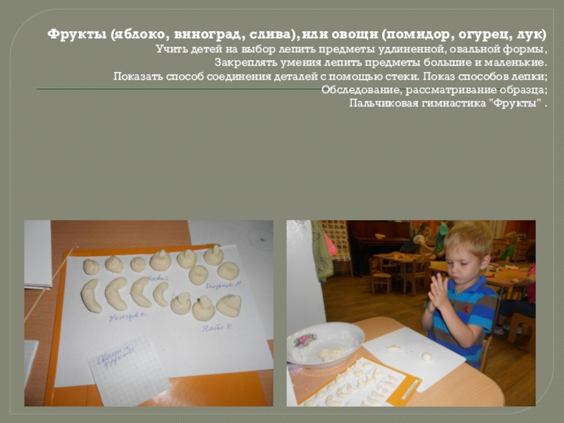 Фрукты (яблоко, виноград, слива),или овощи (помидор, огурец, лук)   Учить детей на выбор лепить предметы удлиненной,