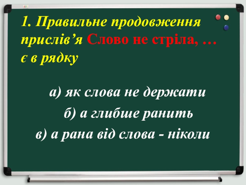1. Правильне продовження прислів’я Слово не стріла, … є в рядку