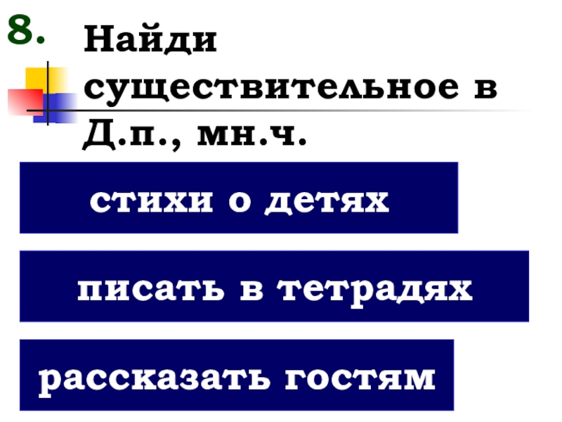 Найди существительное в Д.п., мн.ч.рассказать гостямписать в тетрадяхстихи о детях8.