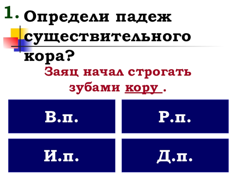 Определи падеж существительного кора?И.п.В.п.Р.п.Д.п.1.Заяц начал строгать зубами кору .