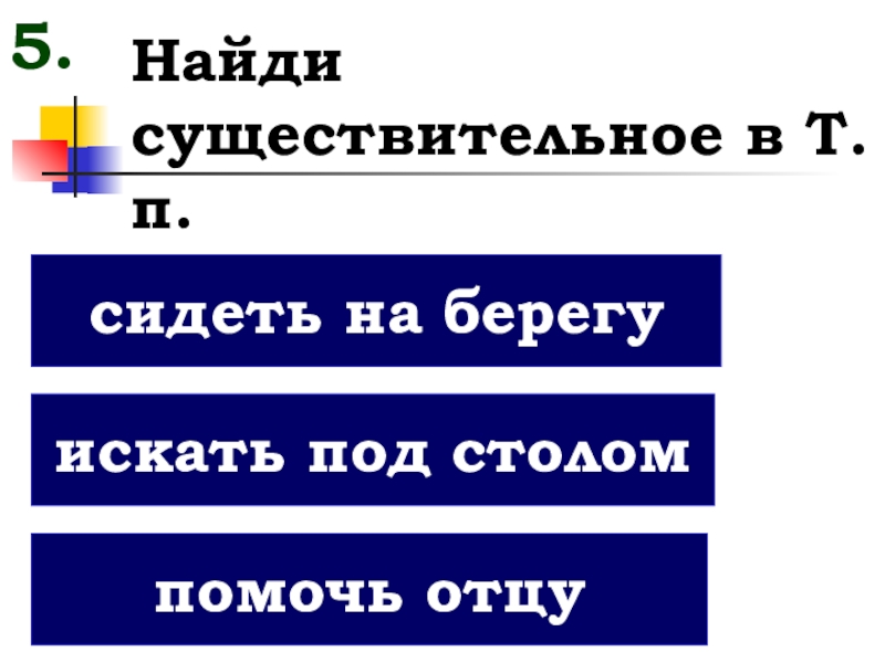 Найди существительное в Т.п.помочь отцуискать под столомсидеть на берегу5.