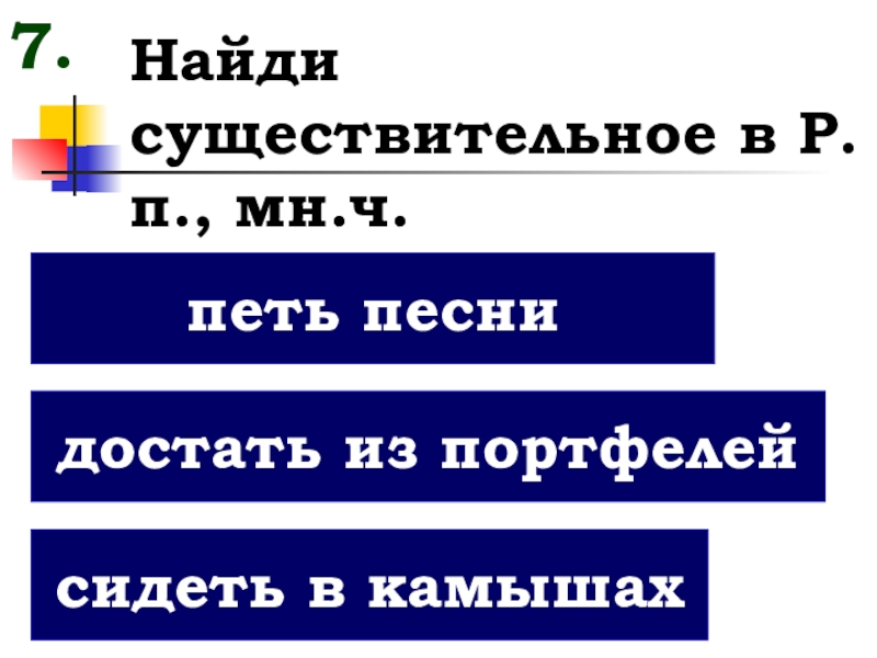 Найди существительное в Р.п., мн.ч.сидеть в камышахдостать из портфелейпеть песни7.