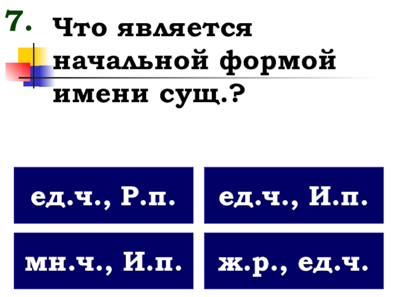 Что является начальной формой имени сущ.?мн.ч., И.п.ед.ч., Р.п.ед.ч., И.п.ж.р., ед.ч.7.