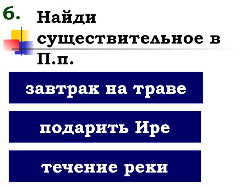 Найди существительное в П.п.течение рекиподарить Ирезавтрак на траве6.