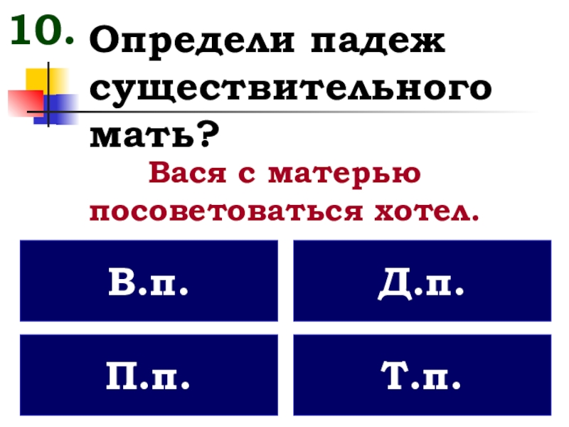 Определи падеж существительного мать?П.п.В.п.Д.п.Т.п.10.Вася с матерью посоветоваться хотел.