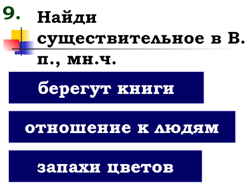Найди существительное в В.п., мн.ч.запахи цветовотношение к людямберегут книги9.