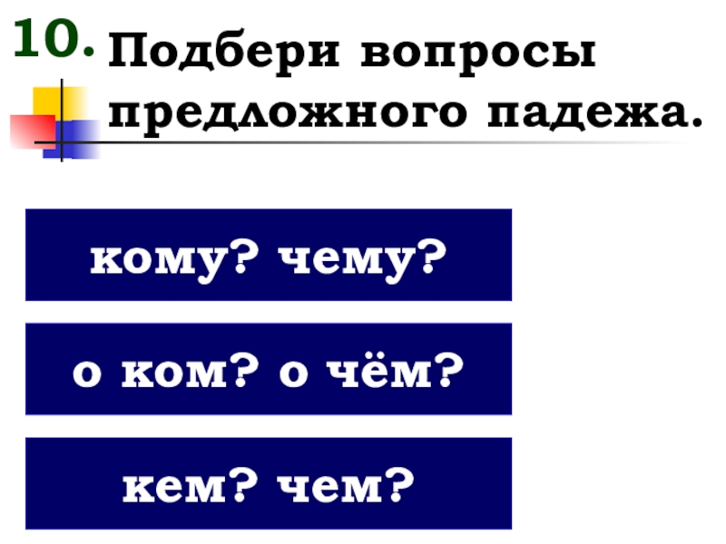 Подбери вопросы предложного падежа.кем? чем?о ком? о чём?кому? чему?10.
