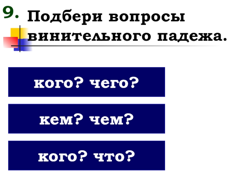 Подбери вопросы винительного падежа.кого? что?кем? чем?кого? чего?9.