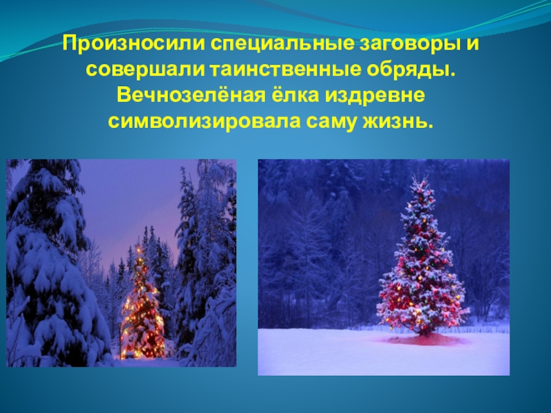 Слайд 5Произносили специальные заговоры и совершали таинственные обряды. Вечнозелёная ёлка издревне символизировала