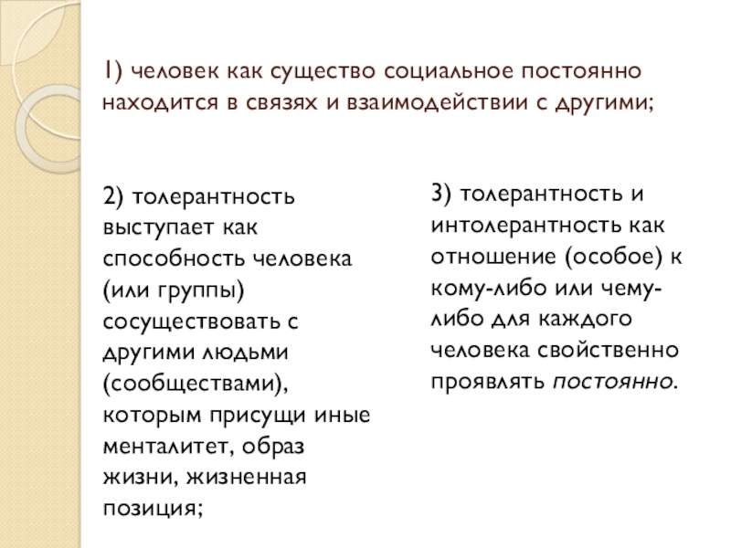 2) толерантность выступает как способность человека (или группы) сосуществовать с другими людьми (сообществами), которым присущи иные менталитет, образ жизни, жизненная позиция;