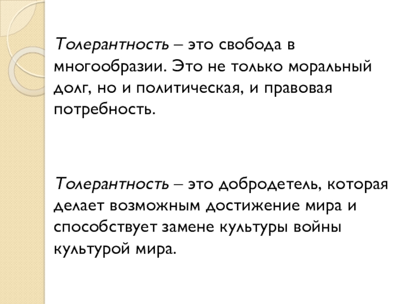 4) толерантность как возможность диалога и накопления согласия различных мировоззрений, религий, культур, различного рода образов миропонимания.