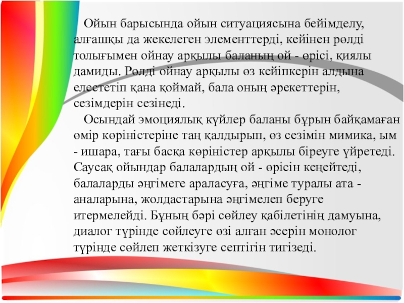 кейінен рөлді толығымен ойнау арқылы баланың ой - өрісі, қиялы дамиды. Рөлді ойнау арқылы өз кейіпкерін алдына елестетіп қана қоймай, бала оның әрекеттерін, сезімдерін сезінеді.