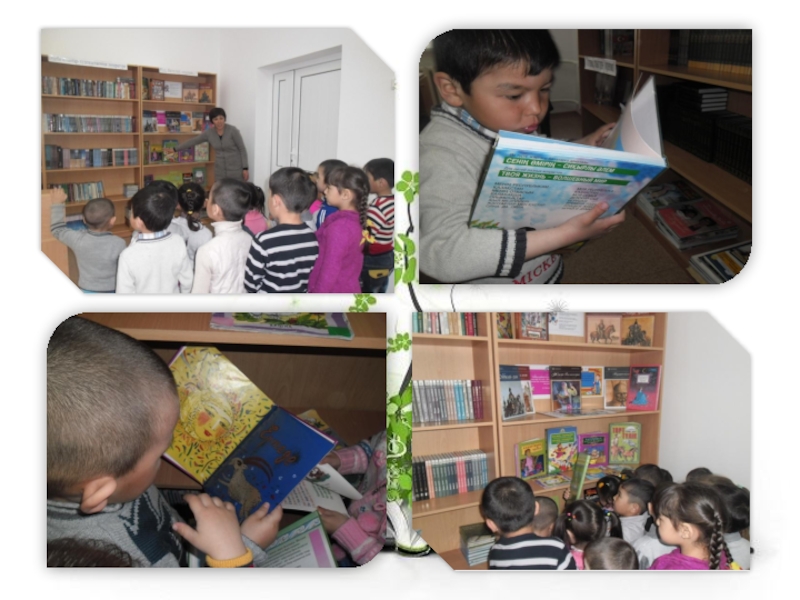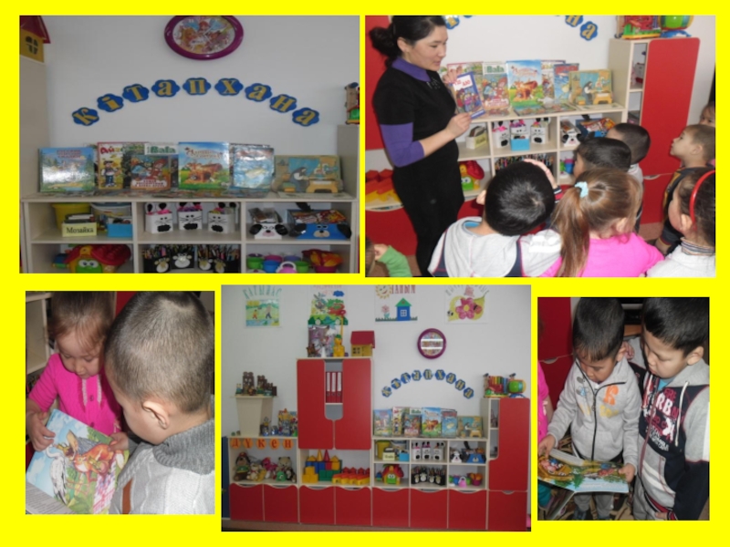 ертегі, әңгіме, өлеңдер тыңдайды және өздері қайталап айтып береді. Балаларды кітаптың жалаң мазмұнымен таныстырып қана қоймайды, сонымен бірге олардың көңілін кітаптардың өзіне, адамзат ақыл-ойының ұлы жетістігіне үнемі аударып отырады. Балаларды кітапты қастерлей білуге тәрбиелеу мүлдем кішкене кезінен, үлкендердің балаларға арналған кітапшаны ұқыпты ұстап, алғашқы оқып беретін сәттен басталады.