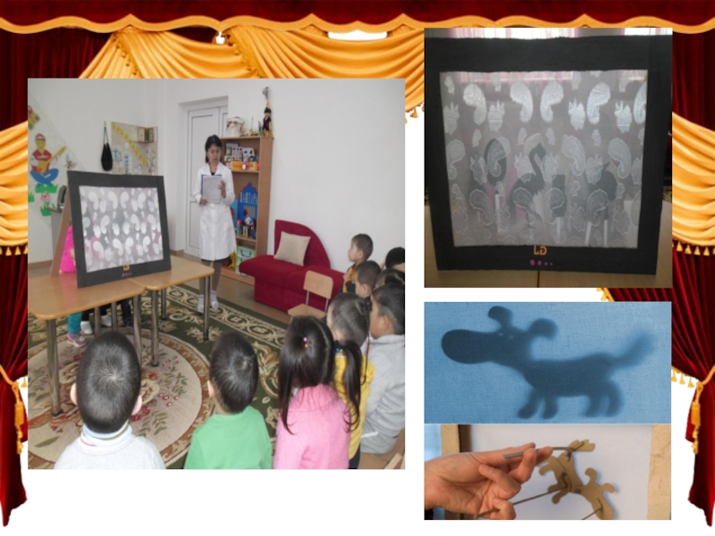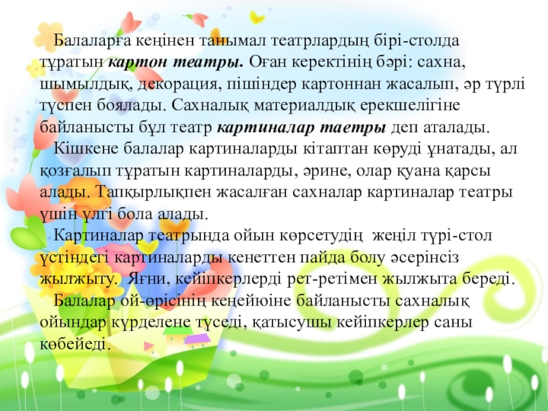 Слайд 18 Балаларға кеңінен танымал театрлардың бірі-столда тұратын картон театры. Оған