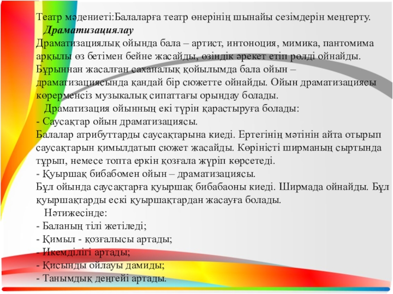 Слайд 29Театр мәдениеті:Балаларға театр өнерінің шынайы сезімдерін меңгерту.